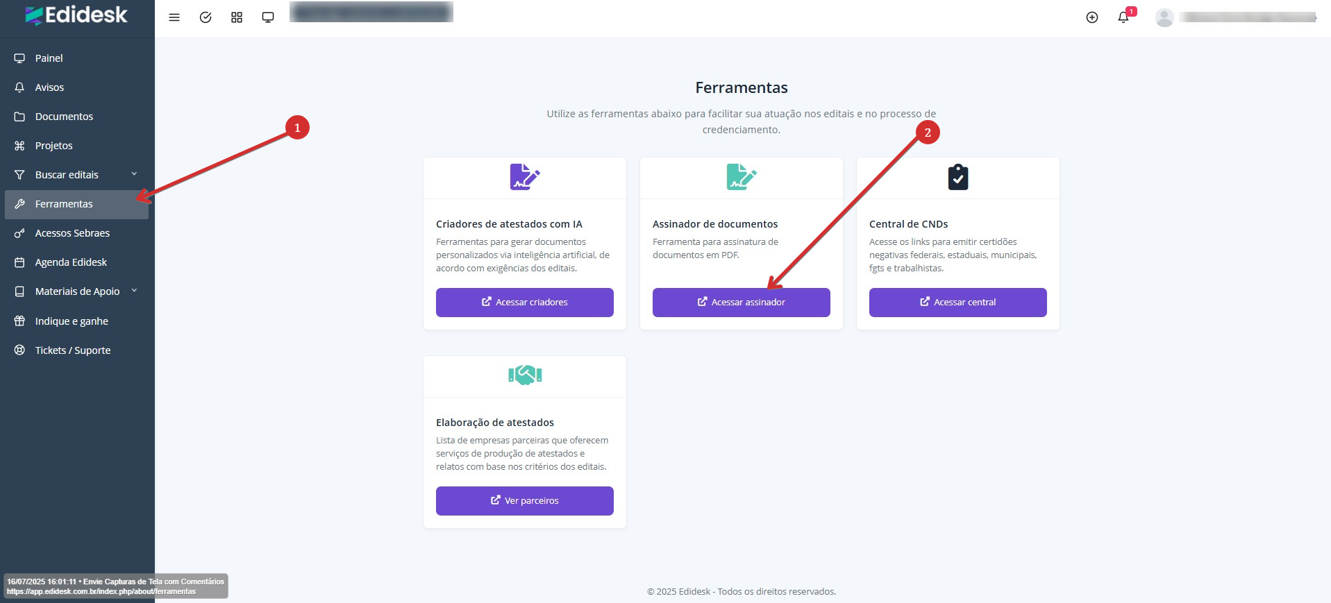 No menu lateral, clique em Ferramentas > Assinador de Documentos.