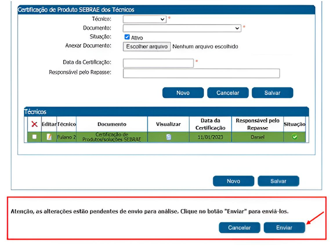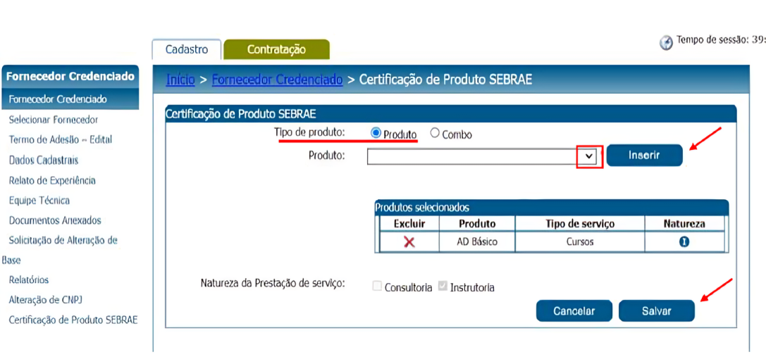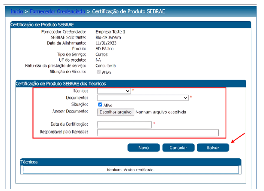 O sistema abrirá as informações do produto e o representante legal preencherá os campos relativos à “Certificação de Produto Sebrae dos Técnicos”.
