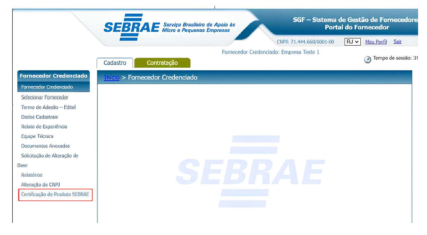 O representante legal deve acessar o portal, clicar “Cadastro“ e no menu lateral escolher a opção “Certificação de Produto Sebrae“.