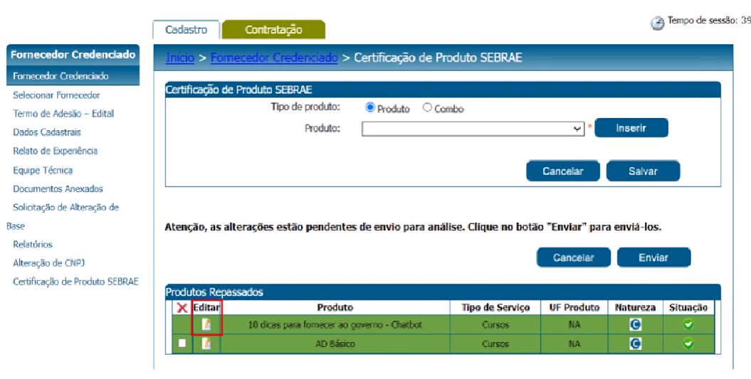 Após salvar, o produto será listado na parte inferior. Na sequência, é preciso clicar em “Editar“ para inclusão do certificado, conforme participação dos membros da equipe técnica.
