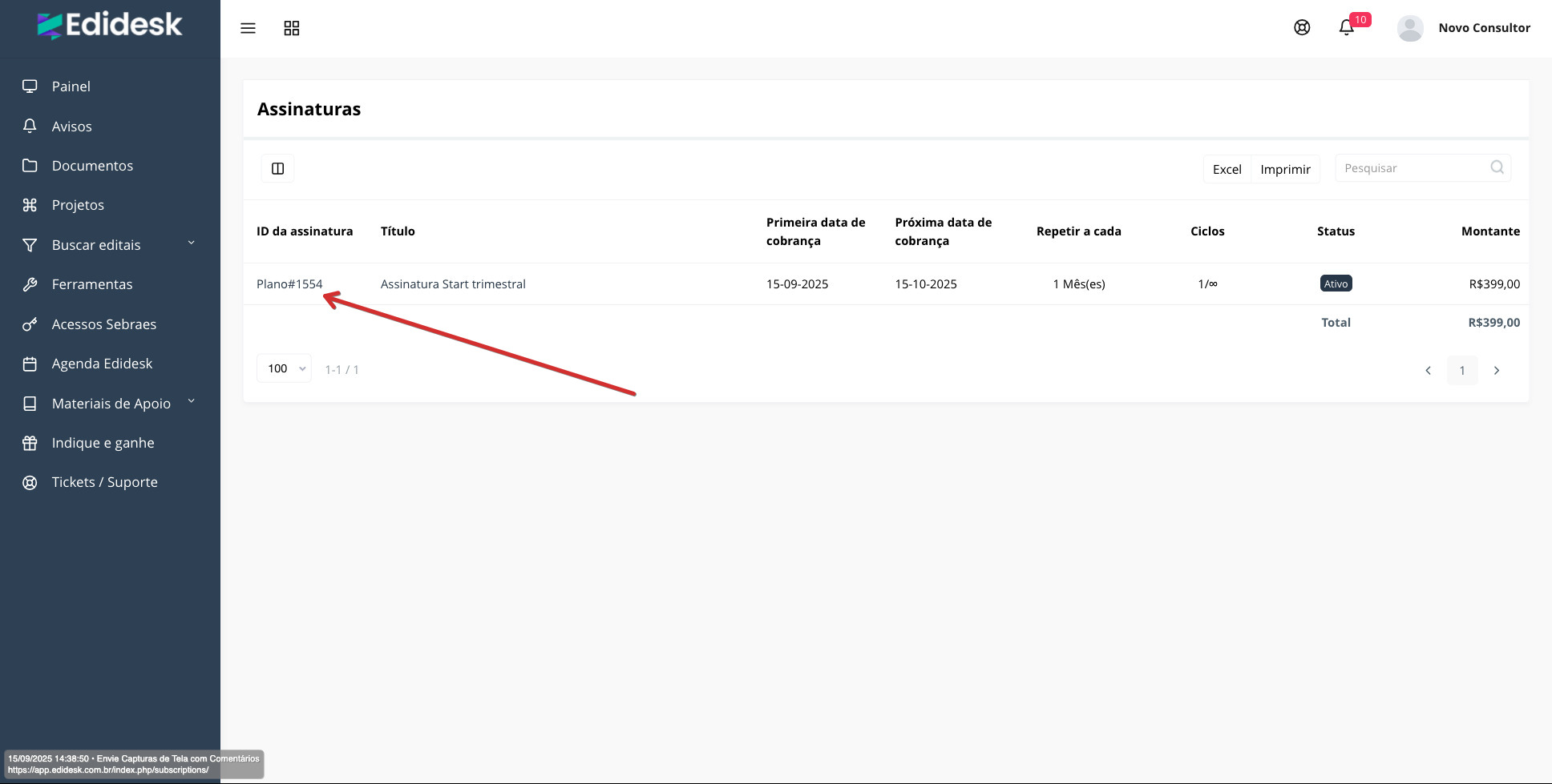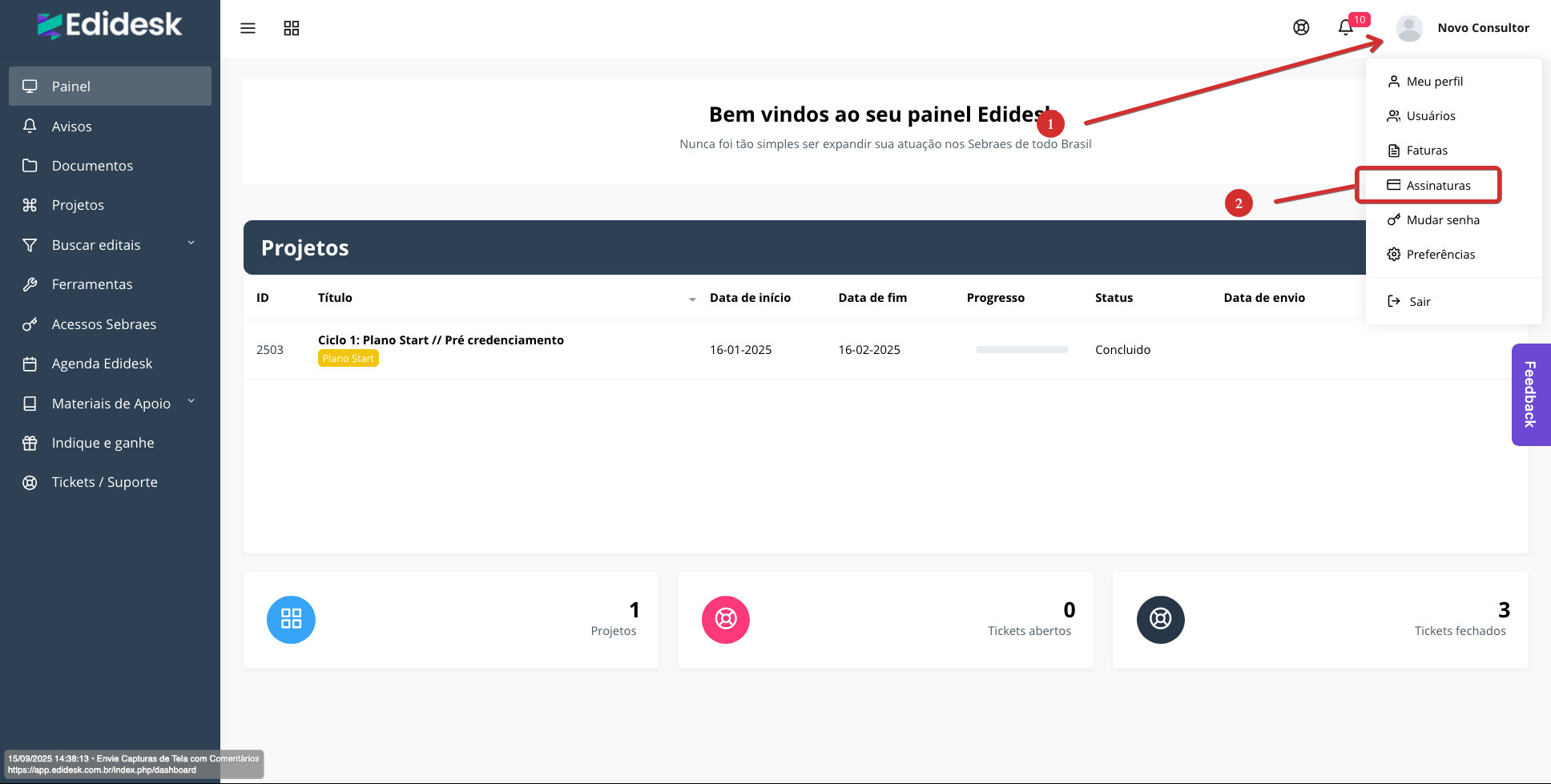 Acesse a plataforma Edidesk e clique no seu nome no canto superior direito. No menu que abrir, selecione a opção Assinaturas ou acesse diretamente o link: https://app.edidesk.com.br/index.php/subscriptions/.