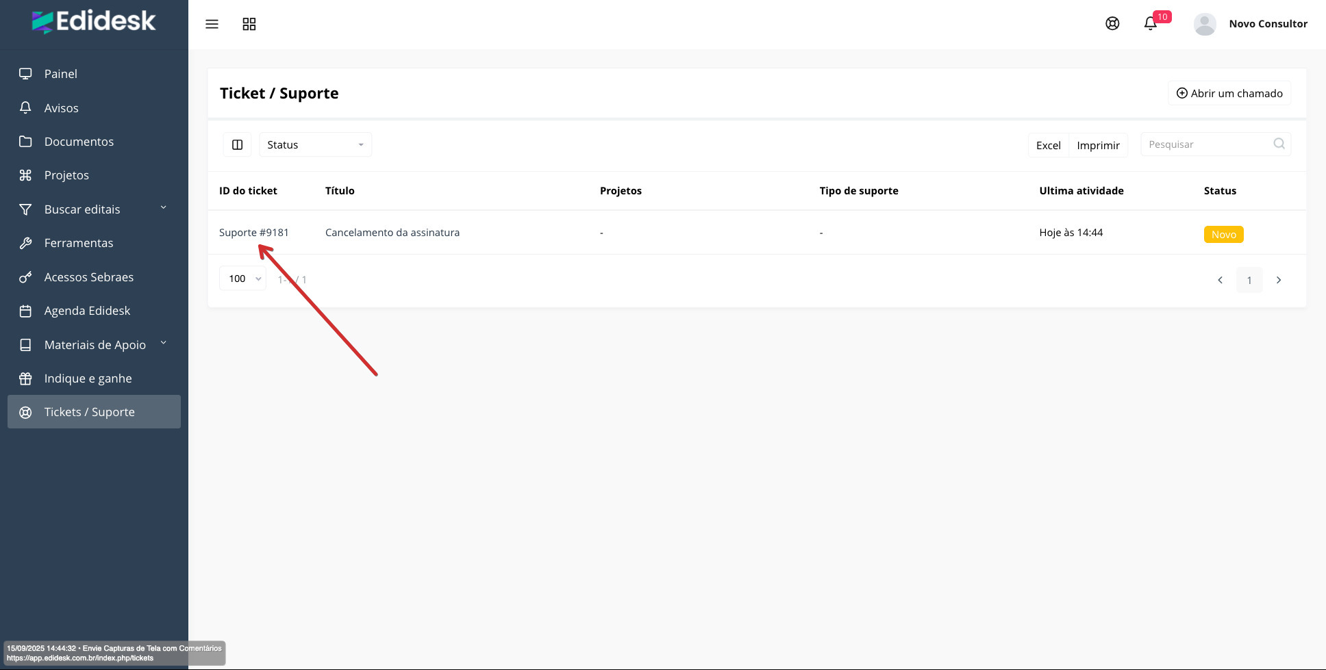 - Acompanhe o andamento do processo pelo menu Ticket / Suporte.
