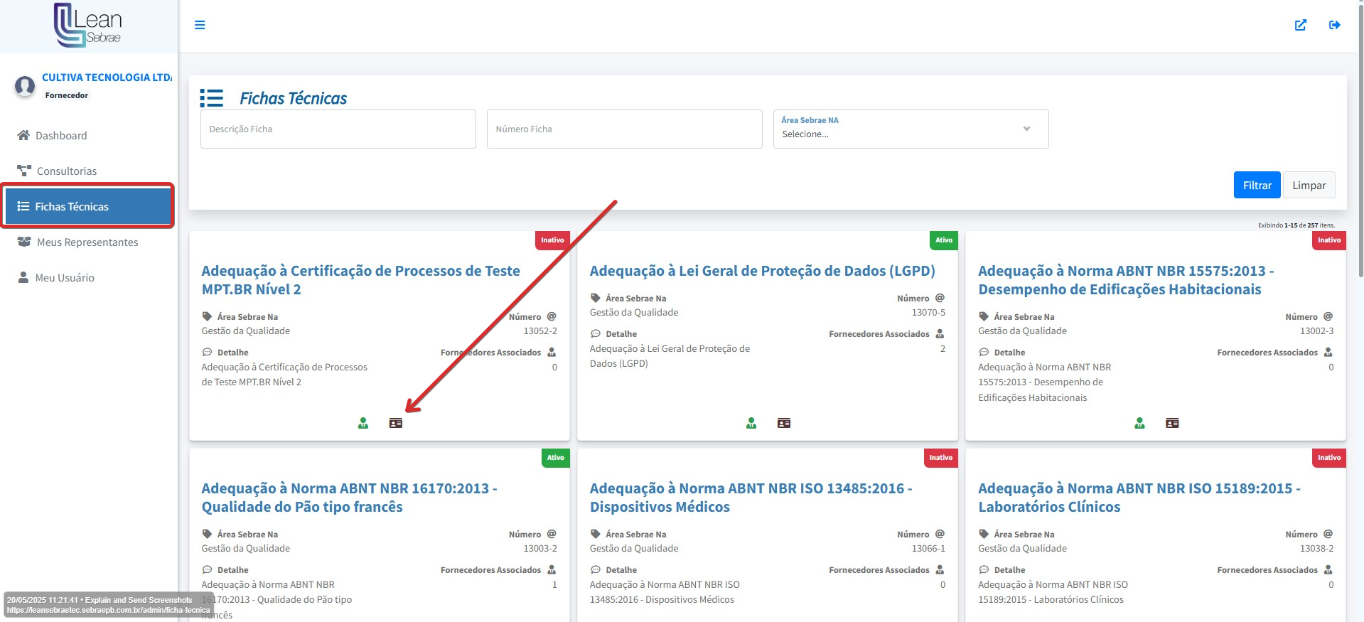 Clique no menu "Fichas TĂ©cnicas" e depois no Ăcone sinalizado abaixo