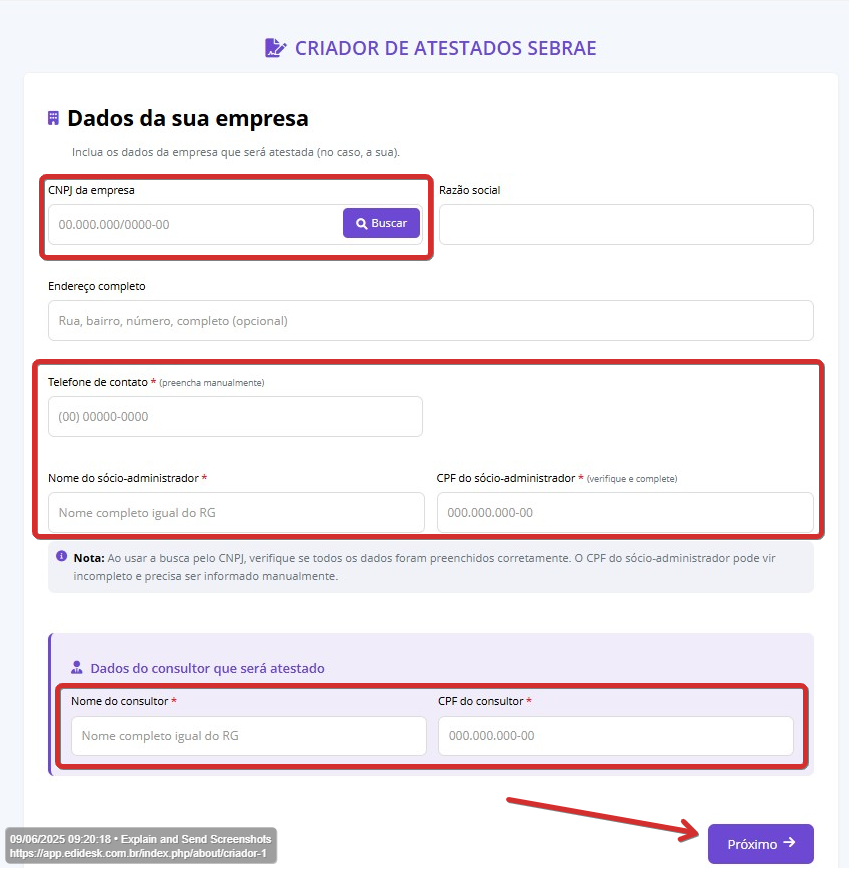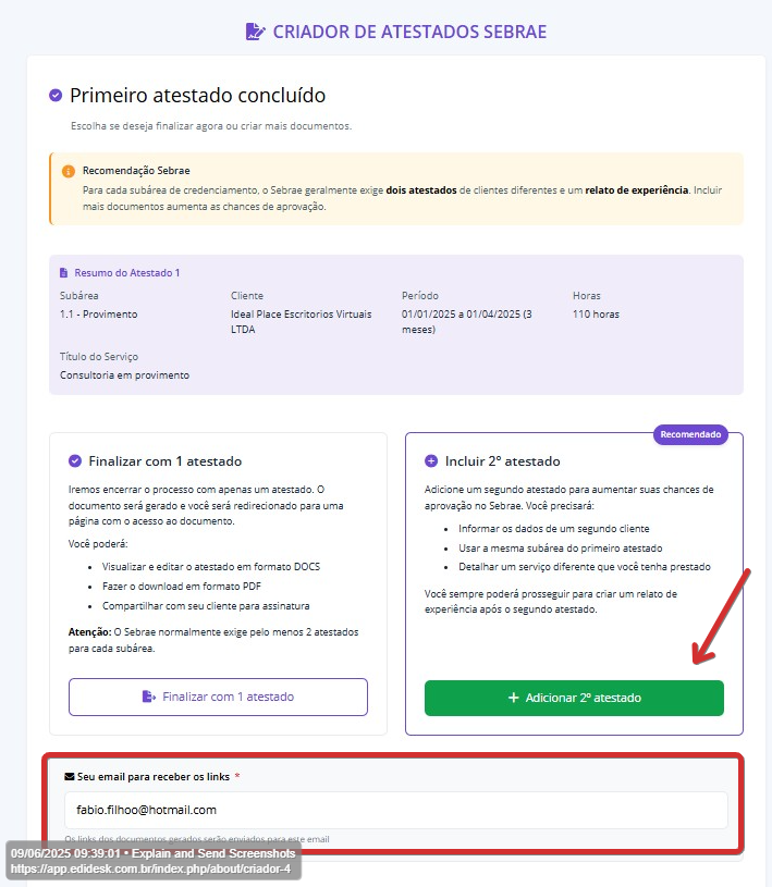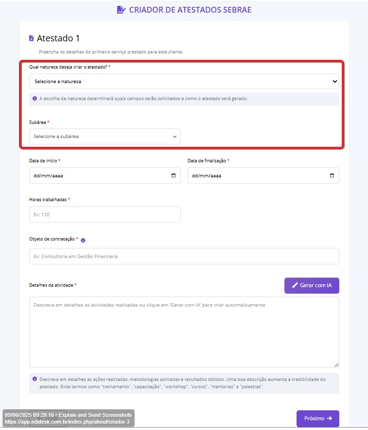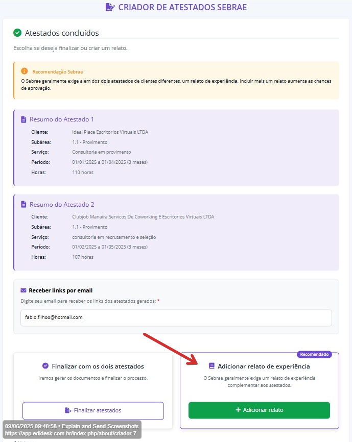 Seja bem-vindo à ferramenta de criador de atestados e relatos da Edidesk! Aqui você encontra o passo a passo para criar seus documentos de forma fácil, rápida e alinhada com os requisitos dos editais do Sebrae.