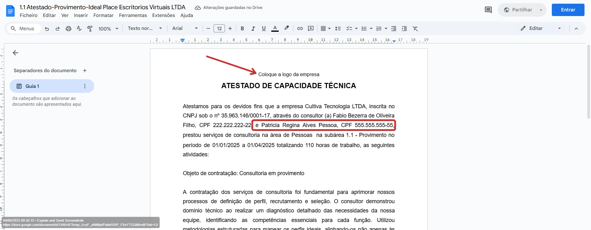 Utilize o mesmo nome que aparece em contrato, proposta ou memorial descritivo.