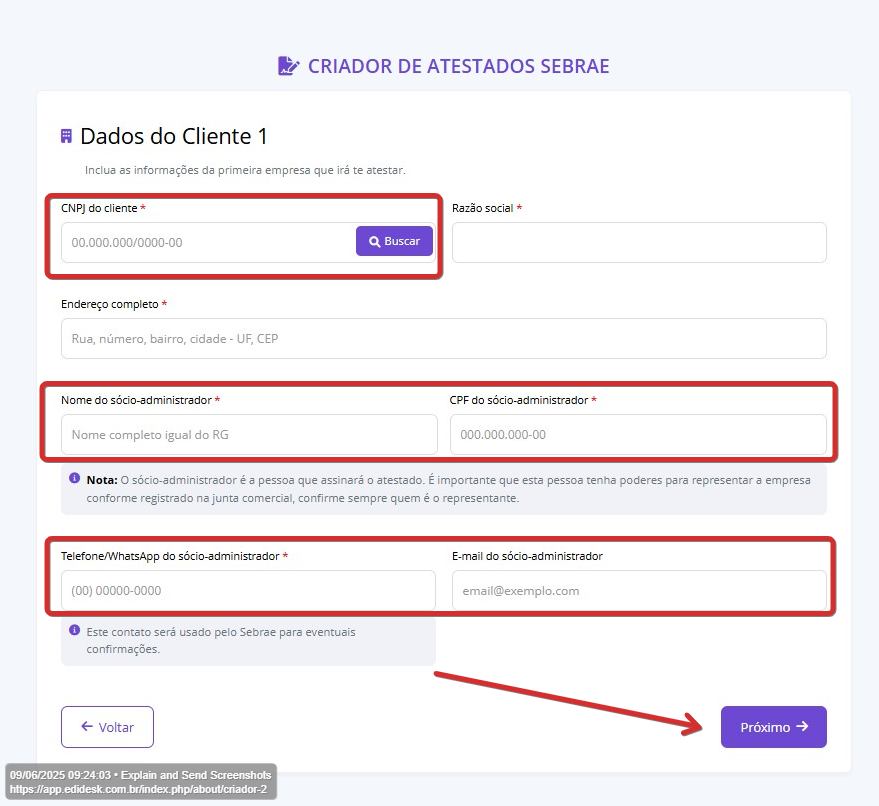 Os dados principais serão preenchidos automaticamente (razão social, endereço, sócio).