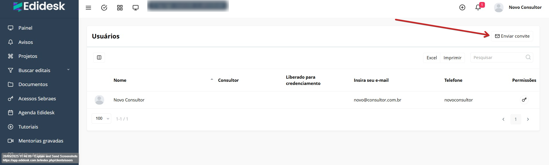 Para cadastrar o consultor na plataforma da Edidesk, você precisa enviar um convite de participação para o consultor que deseja se credenciar.