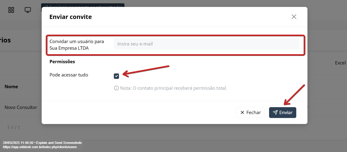 Insira o e-mail do consultor e selecione as permissões que ele deve ter