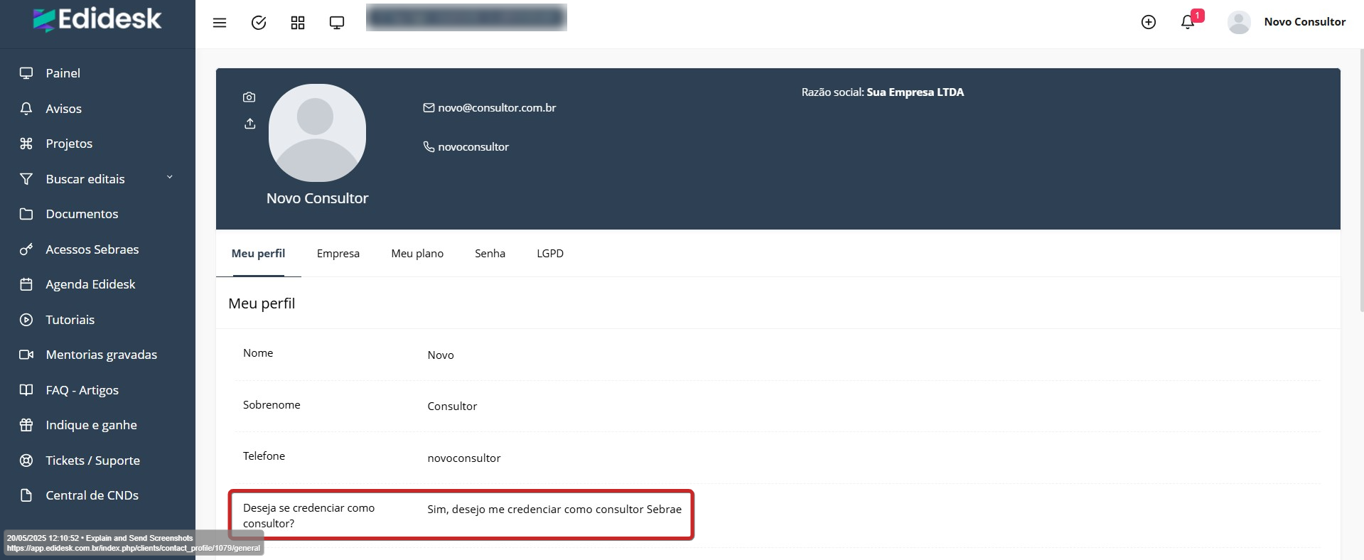 Com isso, o consultor irá receber um e-mail com o acesso para a plataforma, onde deverá realizar o login e preencher os dados do perfil selecionando a opção “Sim, desejo me credenciar como consultor Sebrae”.
