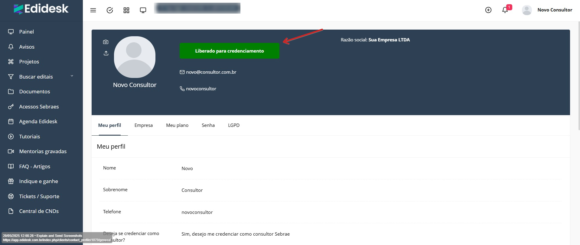 Caso todos os documentos estejam de acordo, irá aparecer a tag “Liberado para credenciamento” no perfil do consultor.