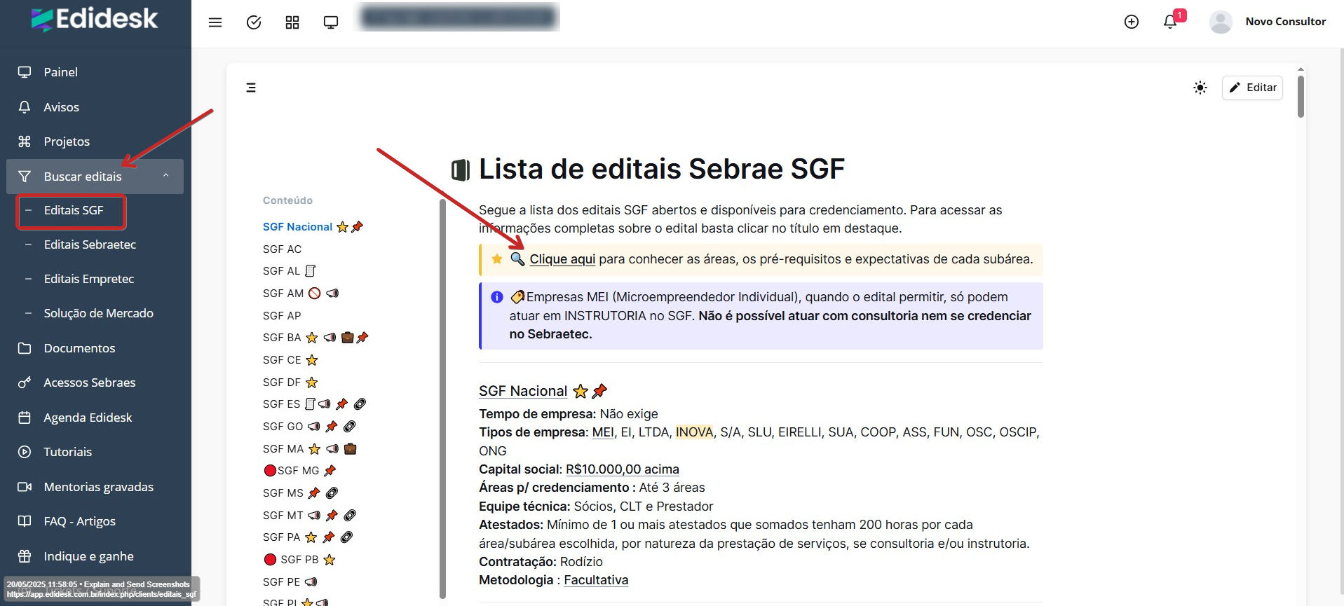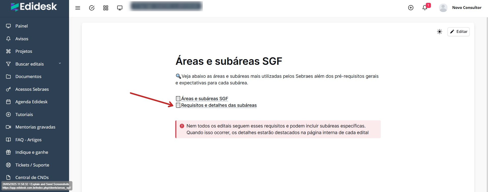 Para encontrar as subáreas do SGF basta acessar a plataforma e clicar em "Buscar Editais" no menu esquerdo, depois em "Editais SGF" e em "Clique aqui para conhecer as áreas".