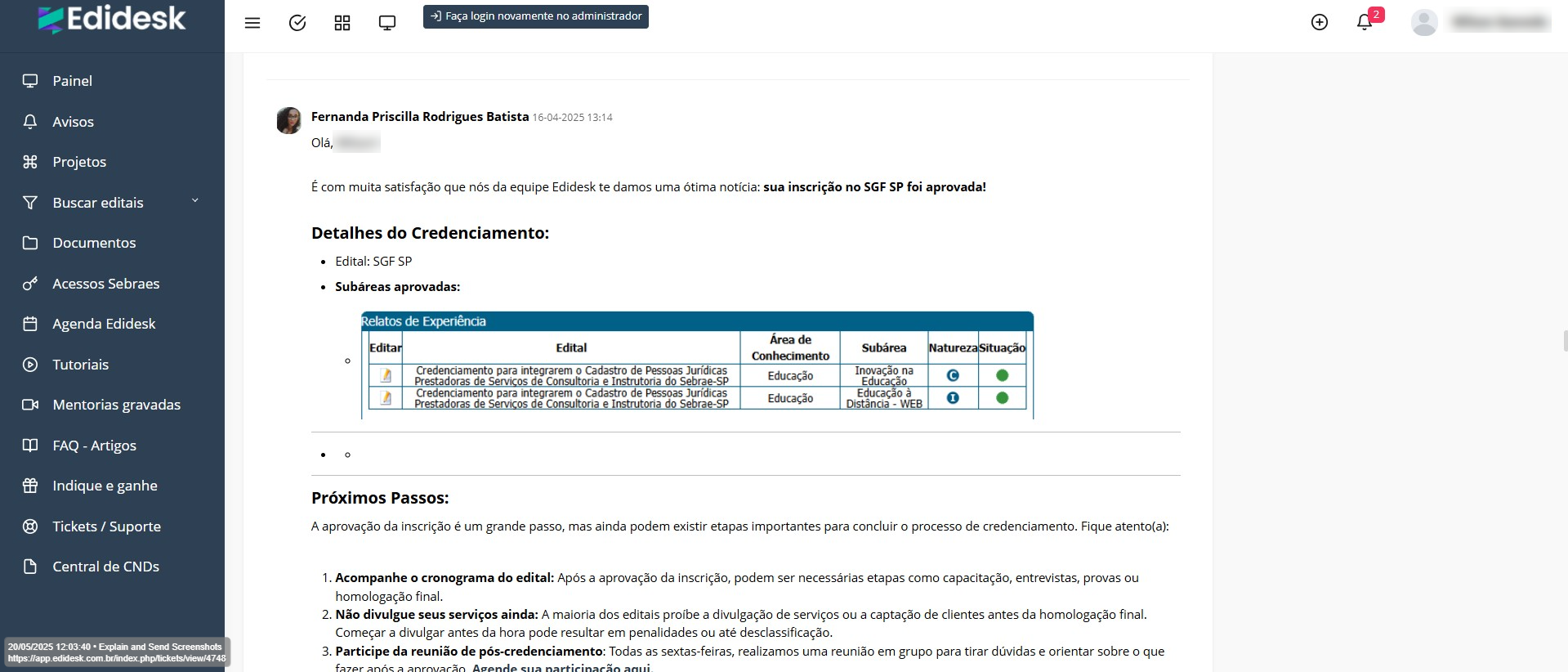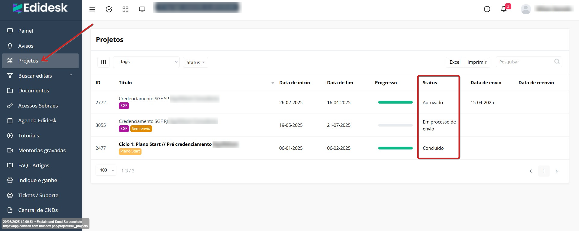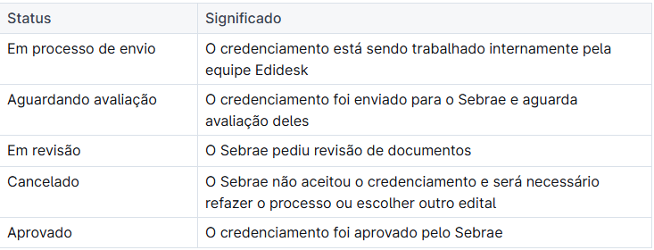 Quando finalizarmos a submissão de seu credenciamento nos Sebraes iremos atualizar a plataforma Edidesk com o status de cada projeto, veja abaixo como acessar: