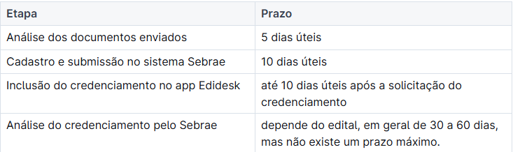 Assim que enviar os documentos assinados para nossa equipe iremos realizar a submissão do credenciamento seguindo as etapas e prazos abaixo: