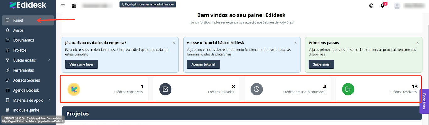 O painel de créditos, localizado diretamente na sua página inicial da plataforma Edidesk, garante total visibilidade e controle sobre seu saldo.