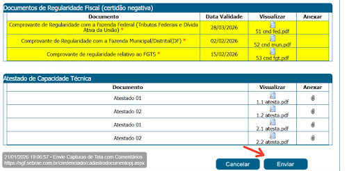 Atenção: não se esqueça de clicar em enviar para que as CNDs sejam encaminhadas para análise do Sebrae.